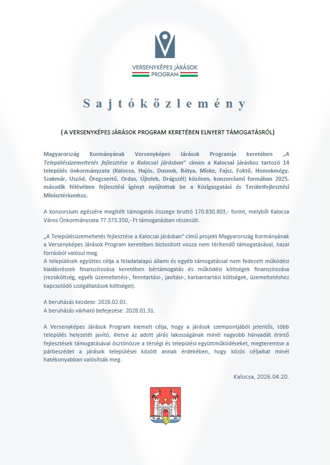 s a j t ó k ö z l e m é n y 2026. április 21. Bővebben: Kalocsa_sajtóközlemény_1552_7085_57_2_2026 iktatószámú