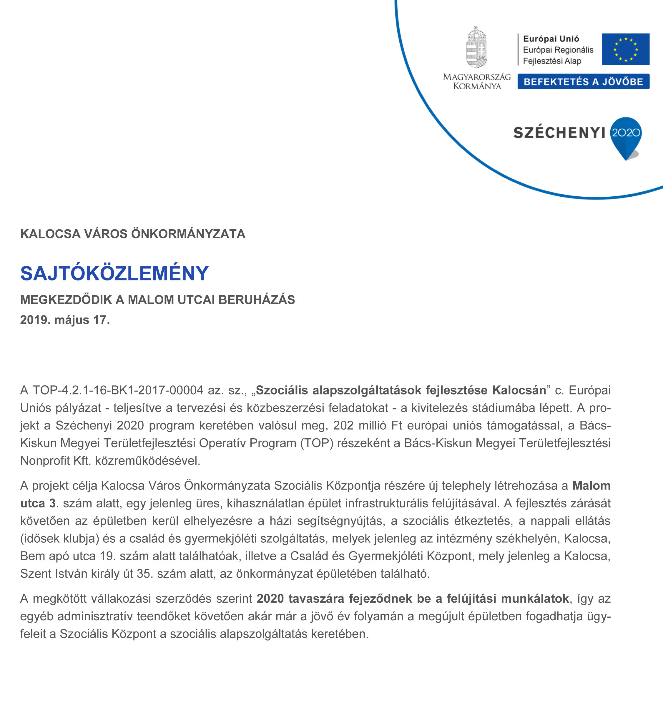 A TOP-4.2.1-16-BK1-2017-00004 az. sz., „Szociális alapszolgáltatások fejlesztése Kalocsán” c. Európai Uniós pályázat – teljesítve a tervezési és közbeszerzési feladatokat – a kivitelezés stádiumába lépett.