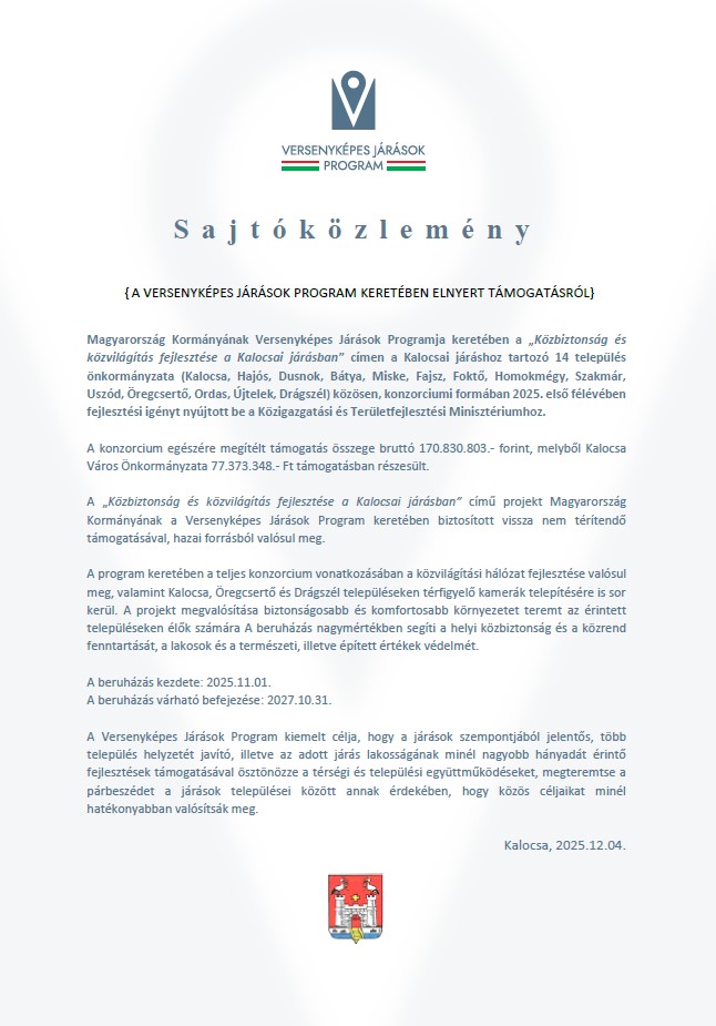 SAJTÓKÖZLEMÉNY VERSENYKÉPES JÁRÁSOK PROGRAM 2025. december 4. Ezúton tesszük közzé a Versenyképes Járások Program hivatalos sajtóközleményét.