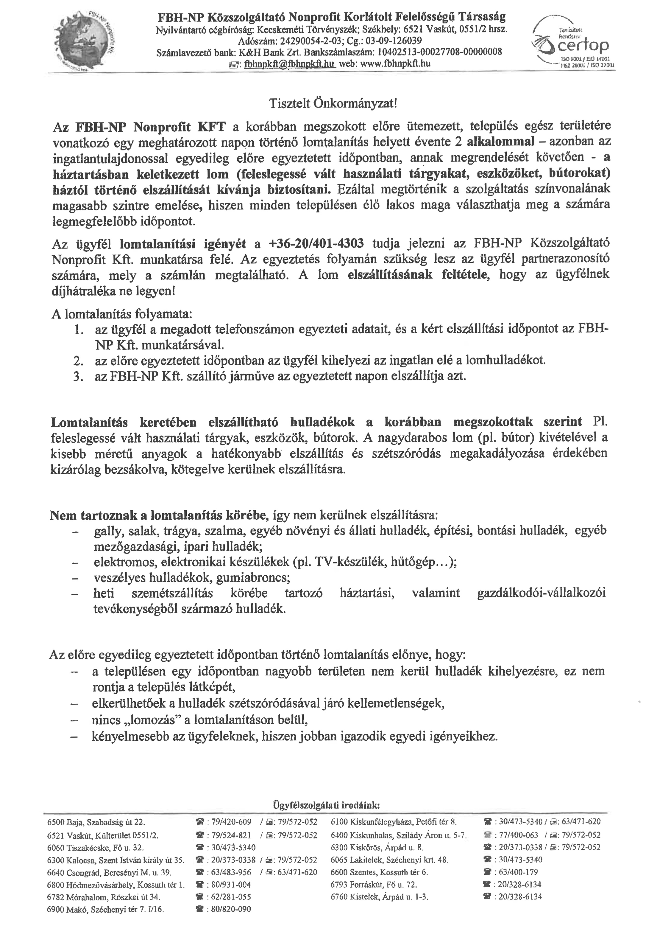 Tájékoztató a házhoz megrendelt lomtalanítás feltételeiről 2019. január 29. Az FHB-NP Nonprofit Kft. tájékoztatója a háztartásban keletkezett lomok megrendelésre, háztól történő elszállításának feltételeiről.