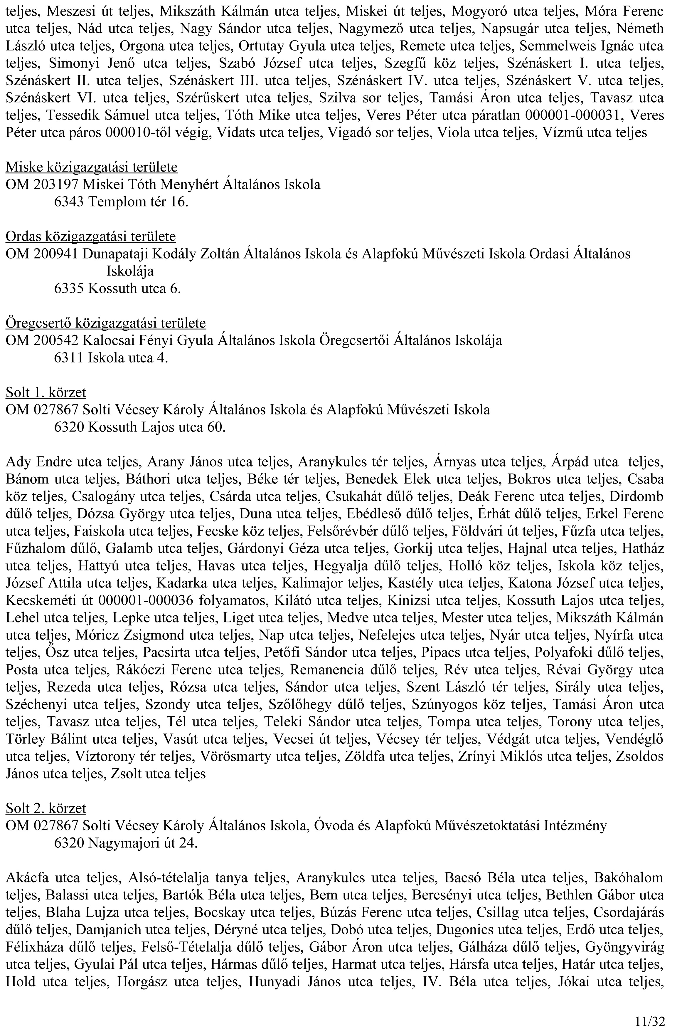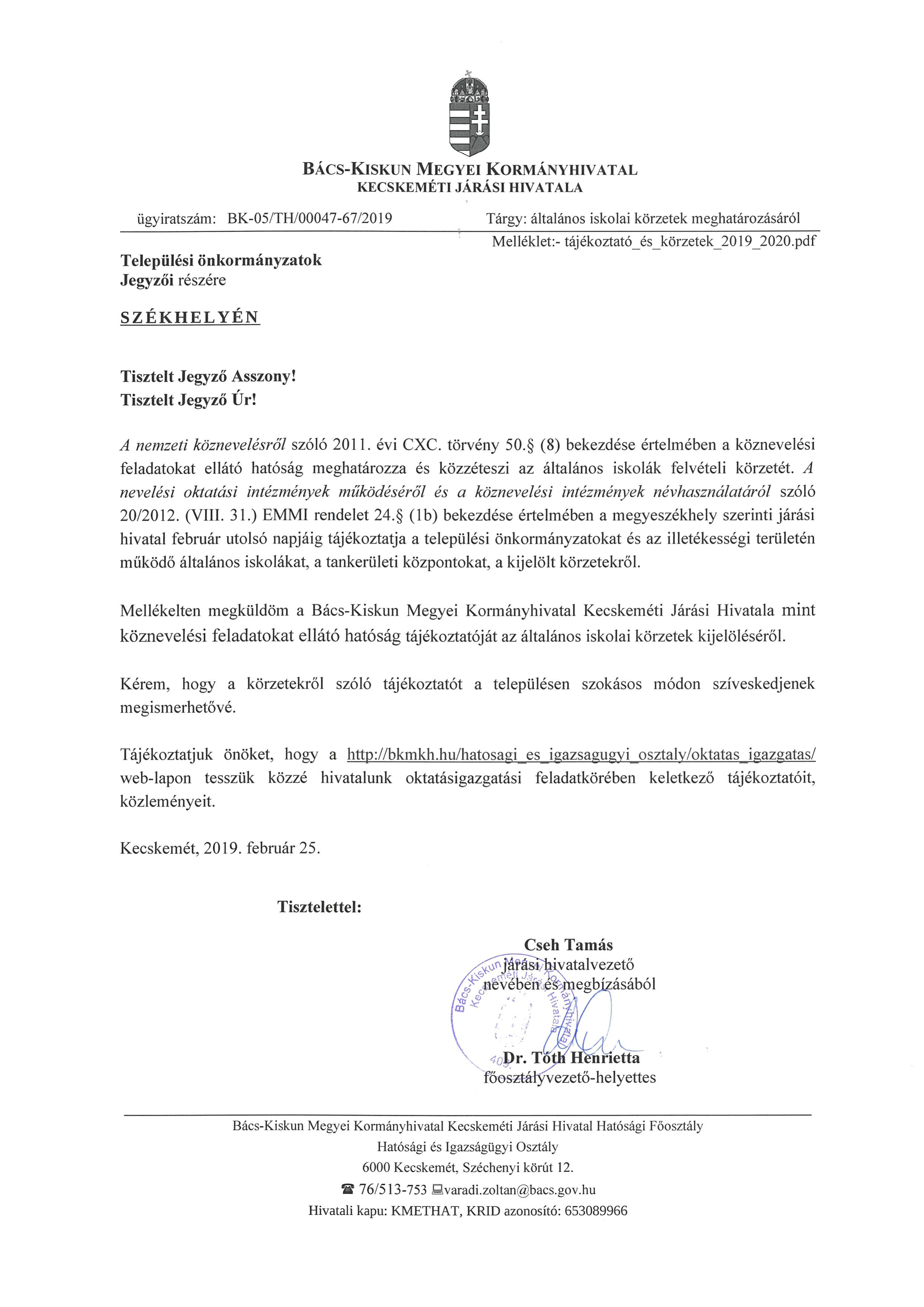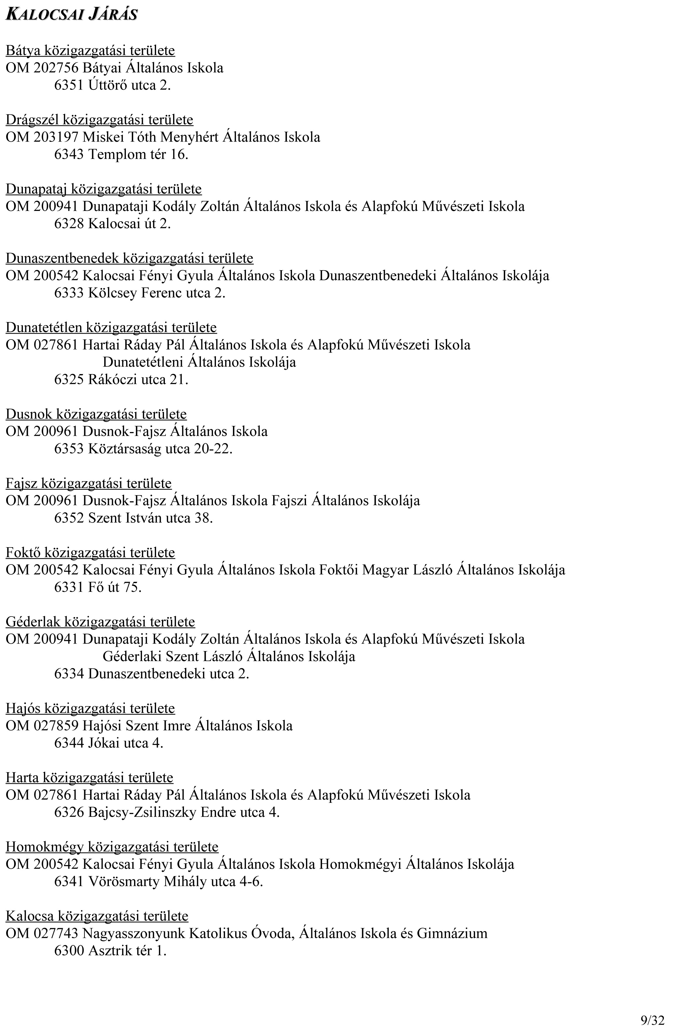 A települési önkormányzatok jegyzői a nemzeti köznevelésről szóló törvény értelmében megkapták a járási hivatal tájékoztatóját az általános iskolai körzetek kijelöléséről. Kalocsa Járás általános iskoláinak beosztását az alábbiakban tesszük közzé:
