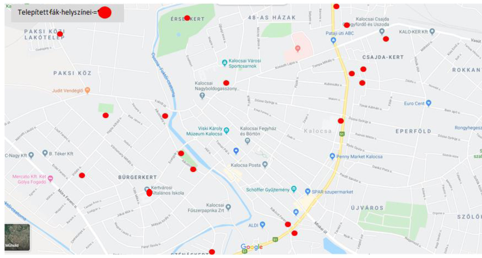 1. sz. térkép, az ültetett fák helyszínei: Vidats u, Kubikus park, Kossuth u, Zrínyi ltp., Bátyai út-Rákóczi u., Érsekkert, Paksi köz, Széchenyi ltp., Sportpálya, Kertvárosi iskola, Vigadó sor, Csilás park, Széchenyi út–Dózsa u., Csajda kert