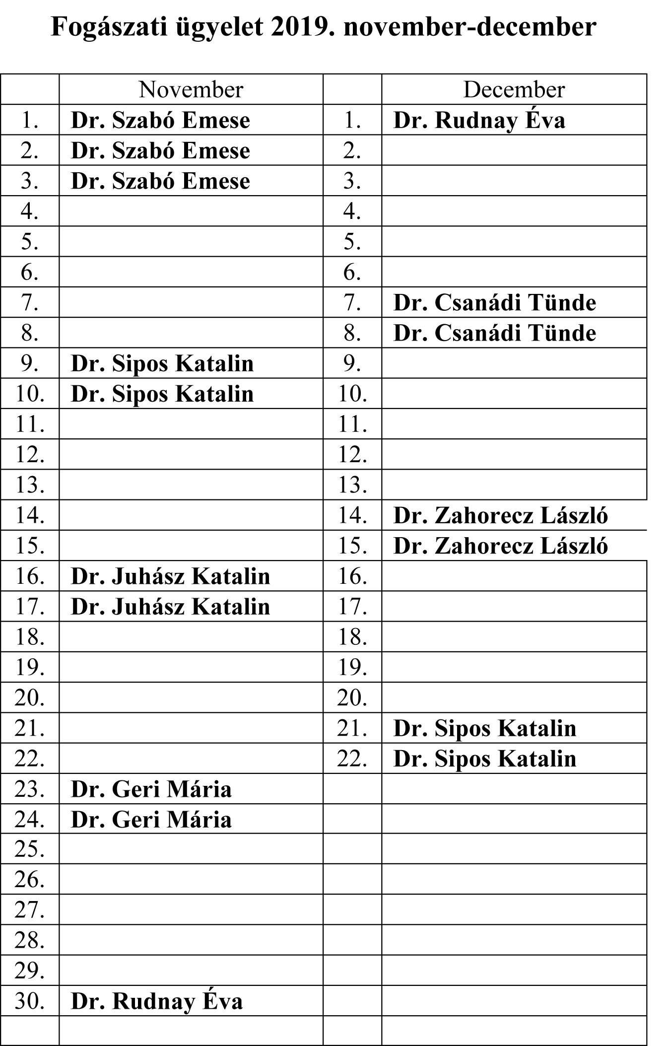Változás a fogorvosi ügyeletben 2019. november 18. Értesítjük a lakosságot, hogy az előzetesen közölt, 2019. IV. negyedévi fogorvosi ügyeletben változás történt. Az alábbi táblázat a november-december hónapról már a módosított adatokat tartalmazza.