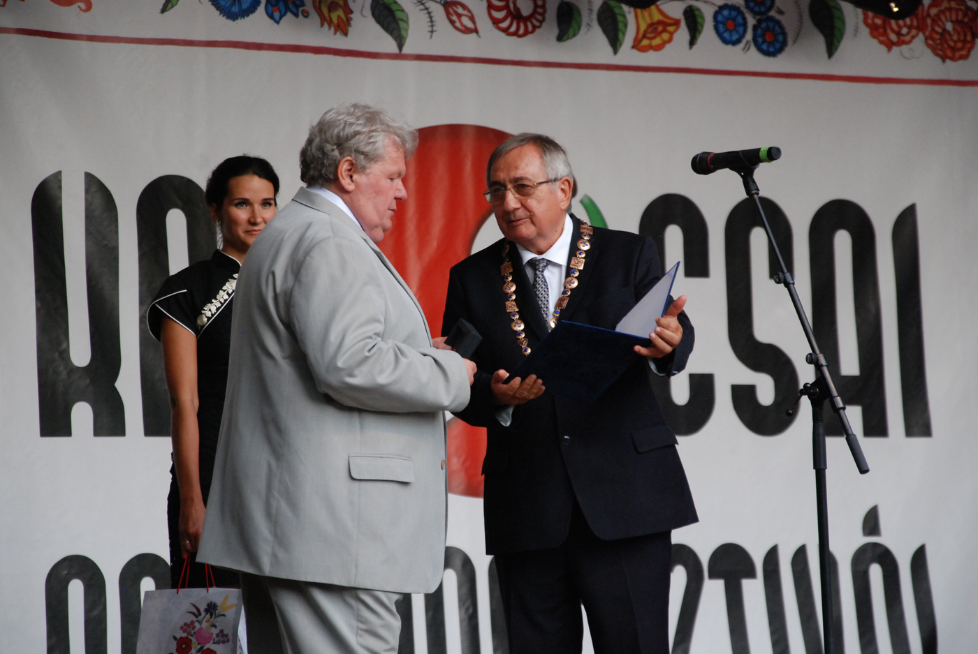A megnyitó következő fontos eseménye a Pécsiné Ács Sarolta-díjak átadása volt, melyet 1996-ban alapított a Kalocsa Népművészetéért Alapítvány. A díj azon személyeknek vagy közösségeknek adományozható, akik Kalocsa és környéke hagyományainak megőrzéséért, terjesztéséért folyamatosan, több éven keresztül tevékenykednek, alkotásaikkal öregbítették Kalocsa népművészetét. Az alapítvány kuratóriumának elnöke, Tamás László ismertette a kuratórium döntését: idén Balogh Csaba Zoltán és Vén Ferencné részesül a kitüntetésben. Szeleczky Attiláné, a kuratórium titkára olvasta fel a laudációkat.