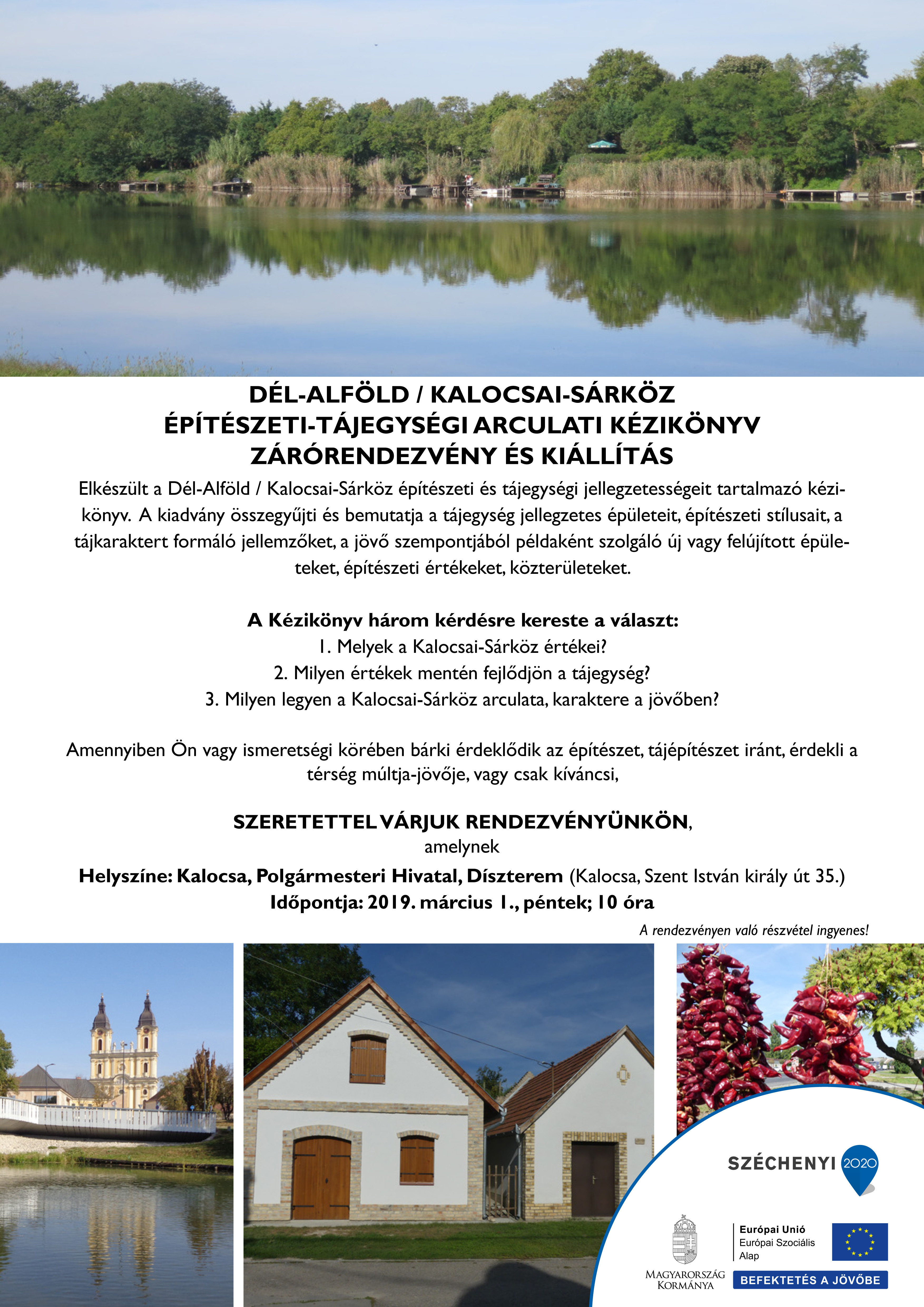 A Kalocsai Sárköz Építészeti-Tájegységi Arculati Kézikönyv elkészült. Bemutatásának zárórendezvénye és kiállítás lesz a Kalocsai Polgármesteri Hivatal Dísztermében március 1-jén, pénteken 10 órától, melyre minden érdeklődőt szeretettel várnak.